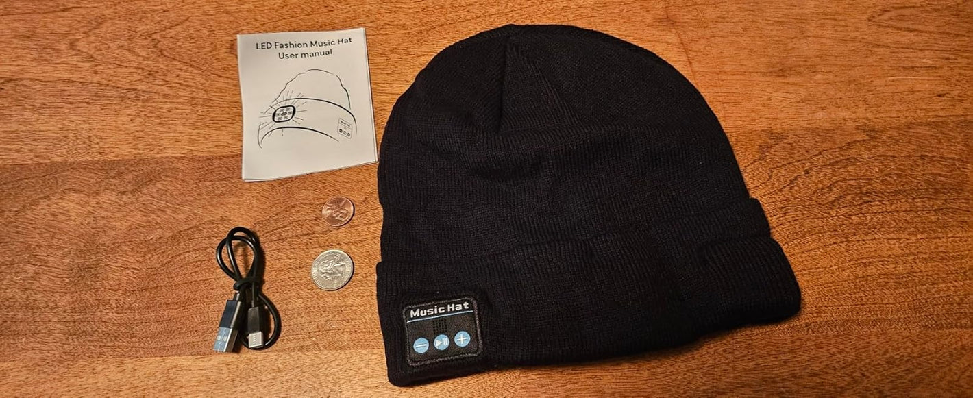 Included in the box: The EchoBand Bluetooth beanie, a USB charging cable, and a user guide.